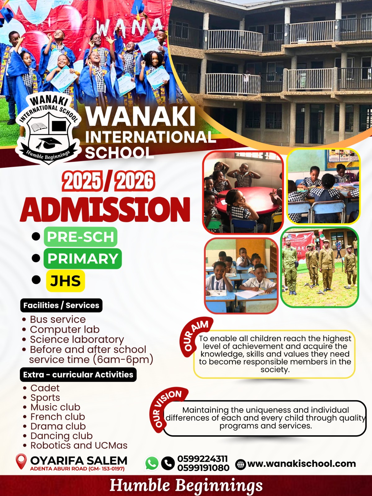 Covering Basic 1 to 6, our curriculum follows the GES-approved subjects including English Language, Mathematics, Science, Our World Our People, Creative Arts, and more — designed to equip students with academic and life skills.